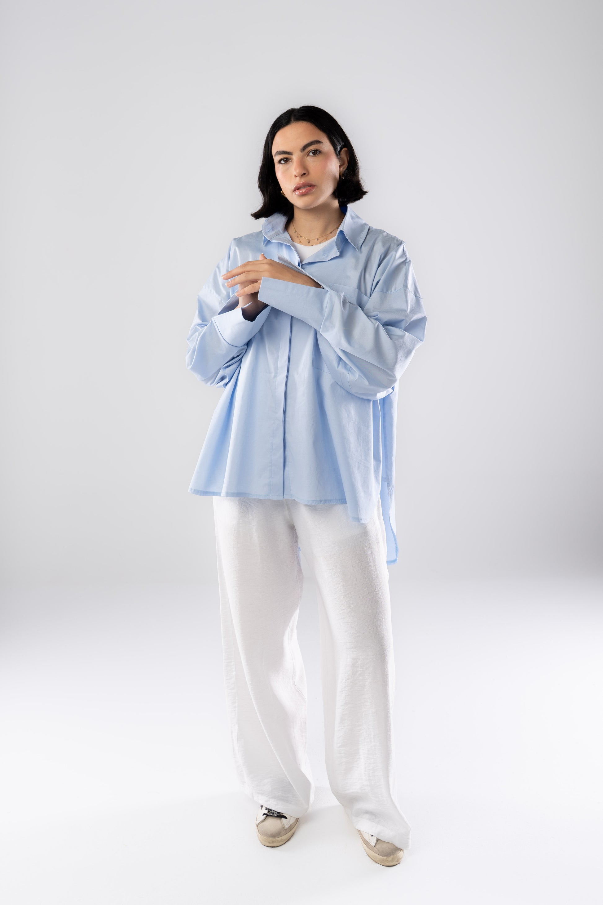 Elevate your everyday wardrobe with this oversized poplin shirt, designed for effortless layering and comfort. Featuring a flowing silhouette and crisp cotton texture, it brings a modern twist to timeless tailoring—perfect for both casual and refined looks.